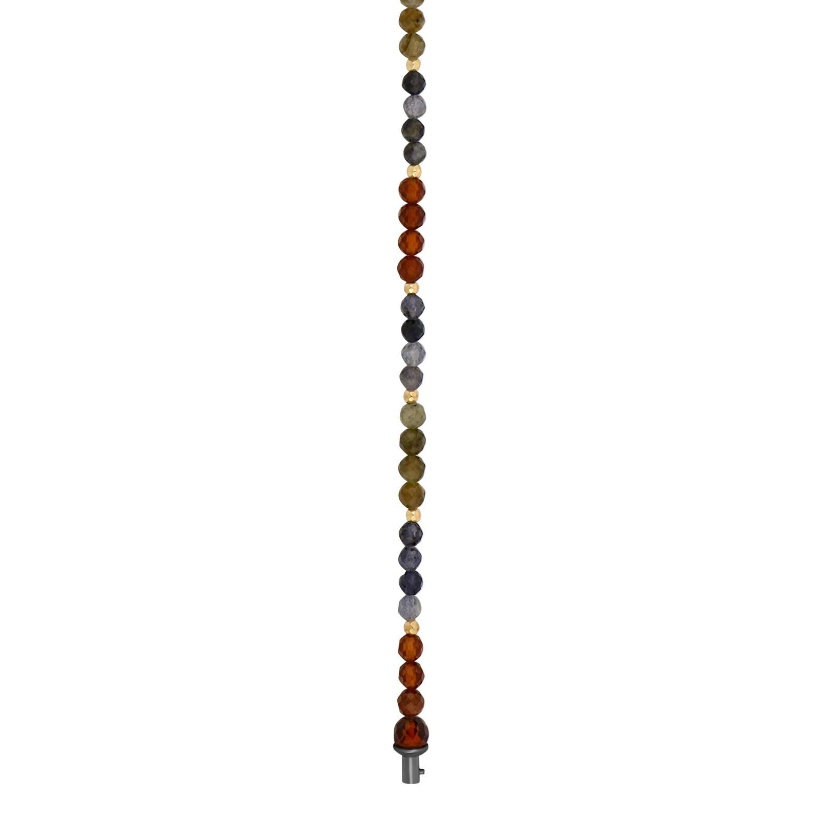 Kæden består af ædelstenene orange granat, iolit og labradorit.